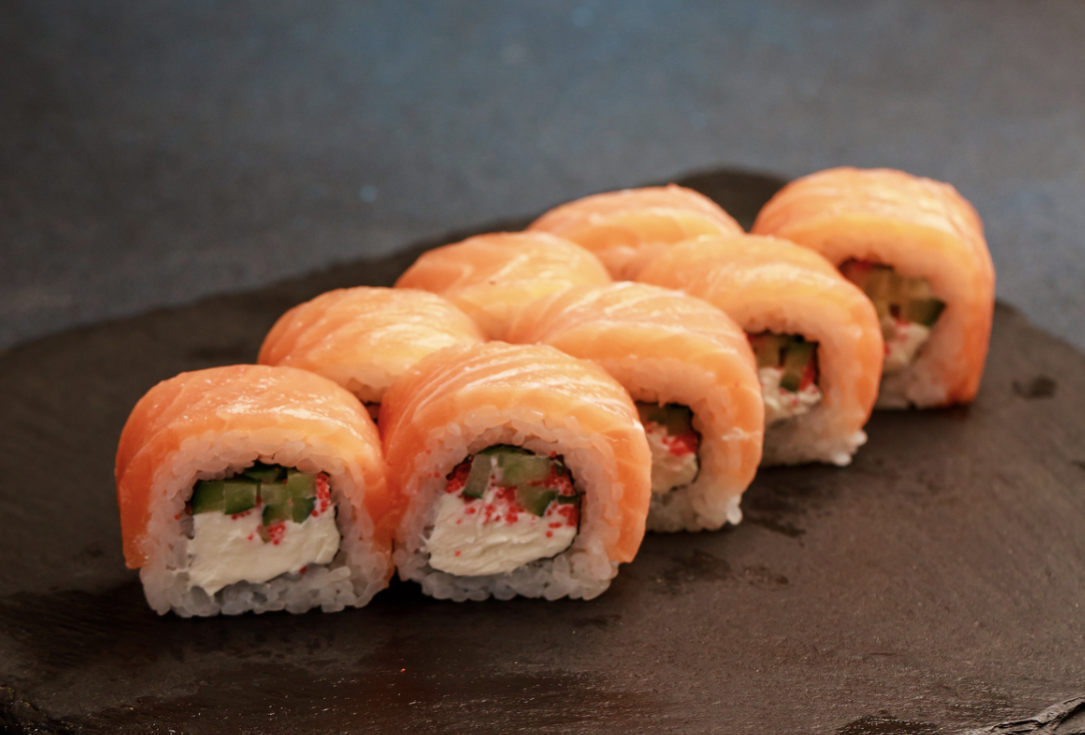 Филадельфия (лосось, авокадо, сливочный сыр): 350-450 ккал за счет сыра.