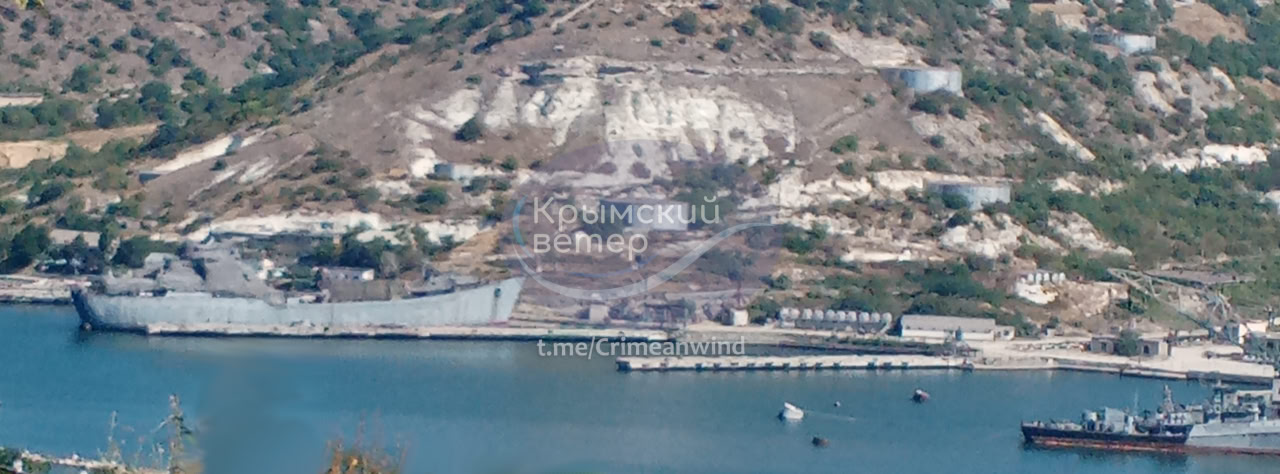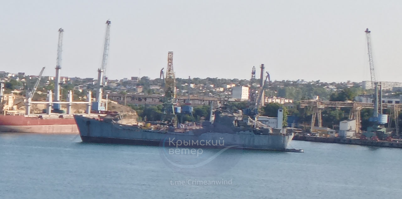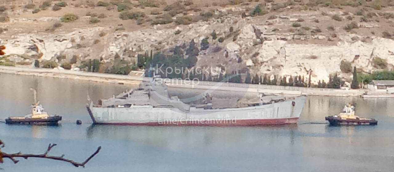 Останнім часом російські військові регулярно перетягують за допомогою буксирів корабель з однієї бухти в іншу. Аби приховати характер руйнувань, отриманих ще у 2023 році внаслідок українського ракетного удару, надбудова судна повністю закрита маскирувальними сітками.