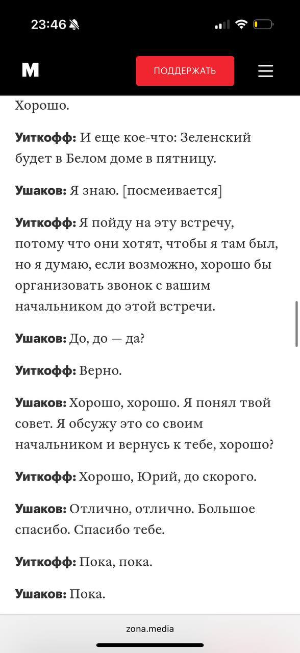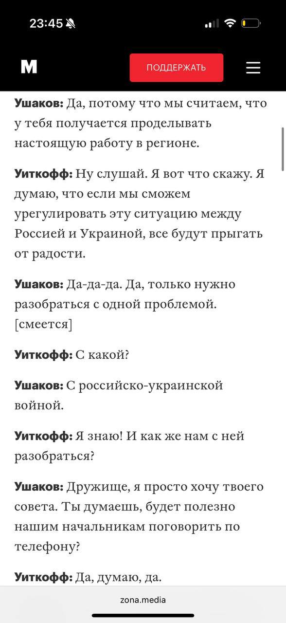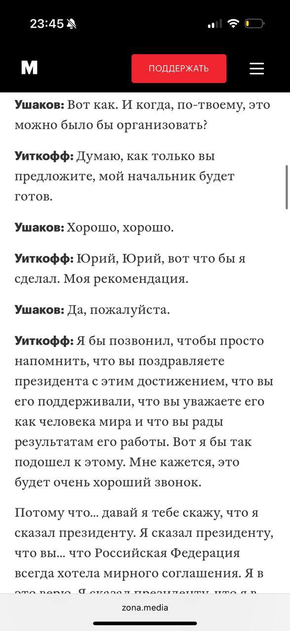 Все почалося з "тріумфу" Трампа в Газі: після "миру" з ХАМАС у вересні 2025-го, Віткофф – "герой дня" – переключається на Україну. 14 жовтня, за день до візиту Зеленського до Білого дому, він дзвонить Ушакову – ключовому "мозку" зовнішньої політики Путіна. Тривалість – 5 хвилин, мова – англійська, тон – "дружній". Віткофф радить: "Путін повинен подзвонити Трампу перед Зеленським, похвалити за Газу і сказати, що росія завжди хотіла миру". Він натякає на "20-пунктовий план Трампа для миру" – з "Донецьком і, можливо, обміном землями" – і обіцяє "простір для маневру" від президента. "Трамп дасть мені свободу дій, щоб закрити угоду", – цитує Bloomberg запис.