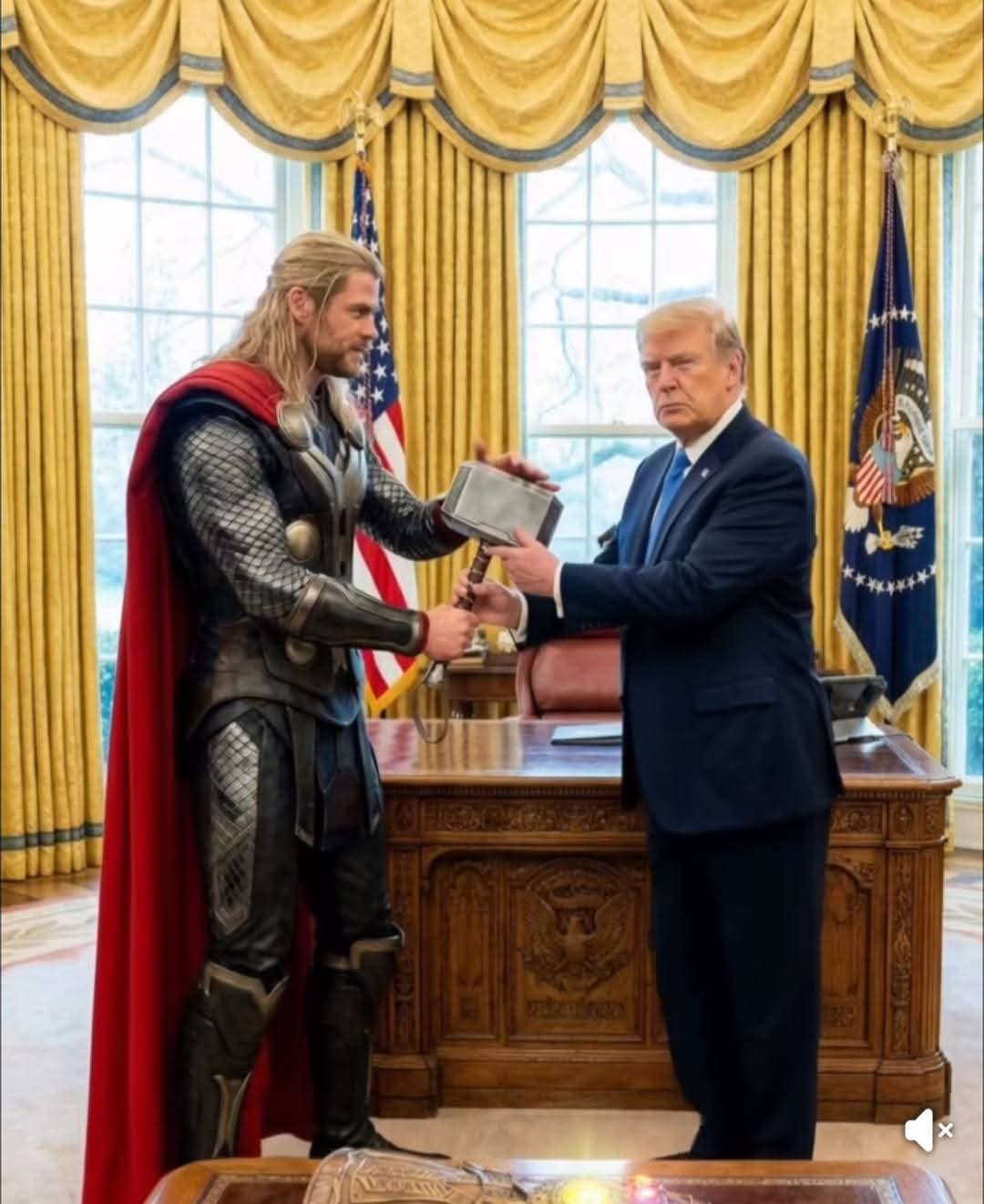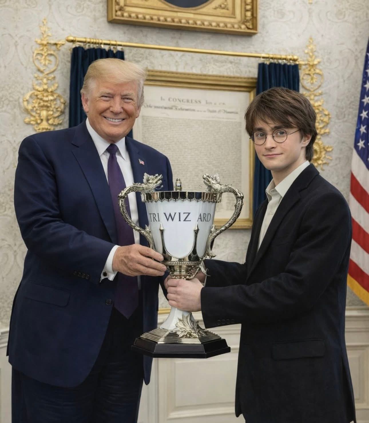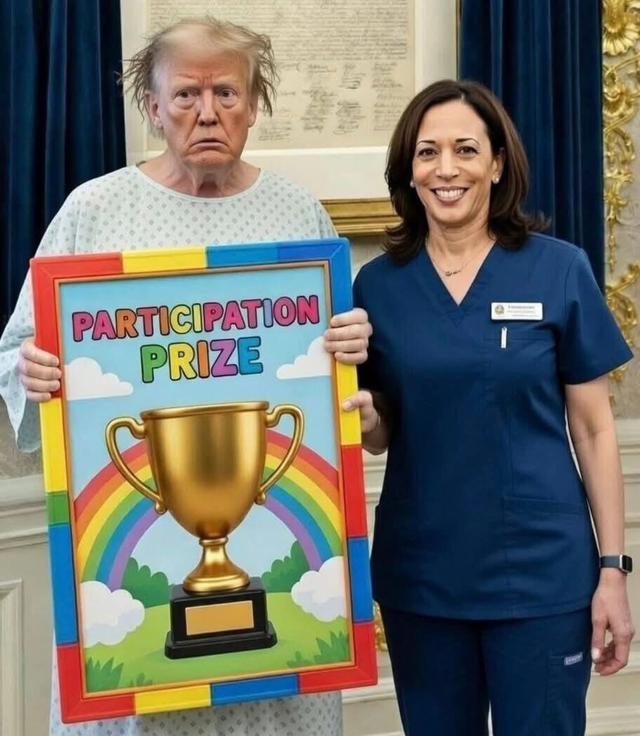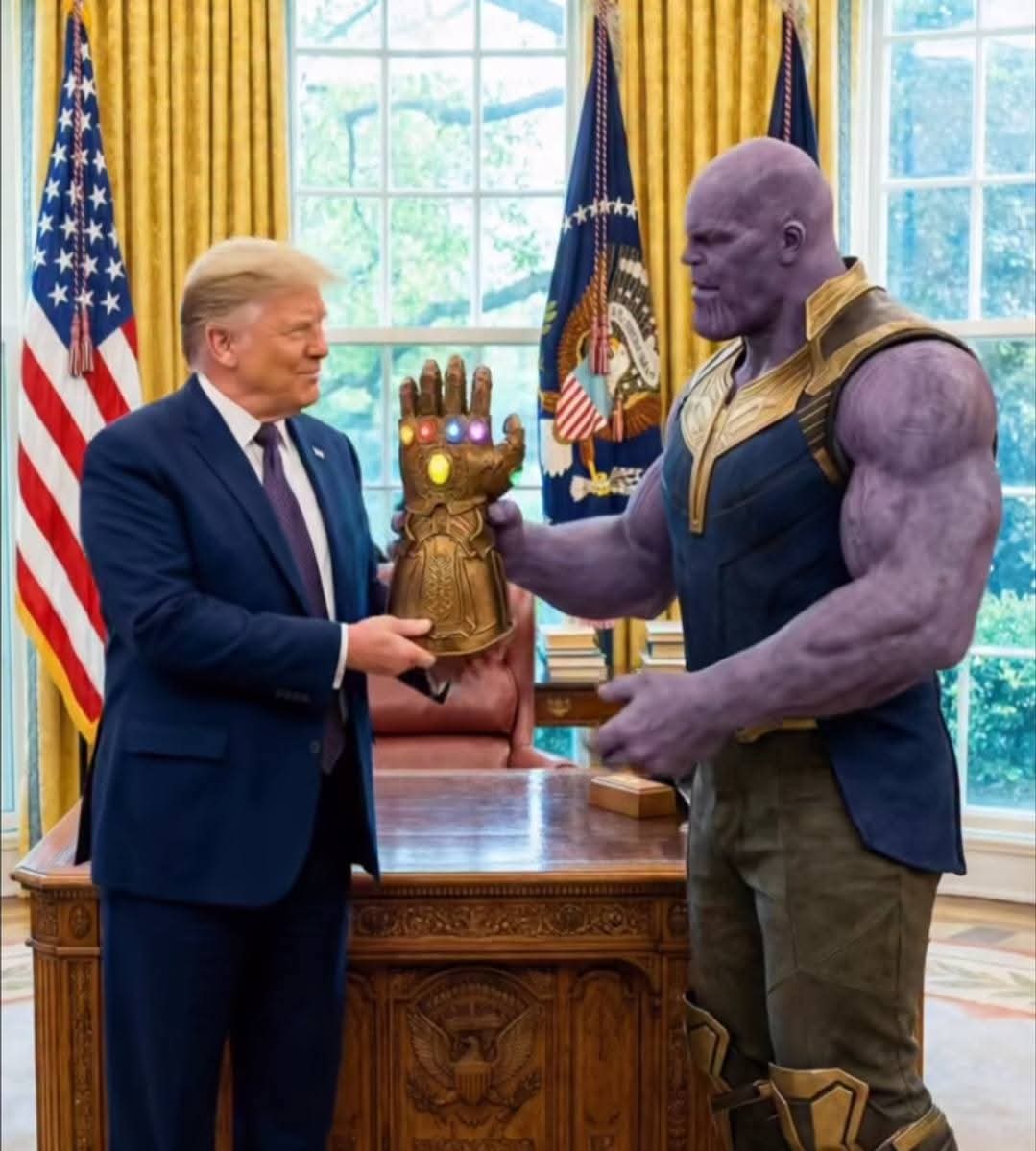 Наприклад, свою здобич вручає Трампу котяра-мишолов, орден і регалії Героя Радянського Союзу передає Трампу Брєжнєв, щедро дарує медалі Адам Кадирови, діляться реліквіями Фродо Беггінс, Буратіно, Джек-Горобнць та багато інших персонажів зі світу кіно, казок і мультфільмів.