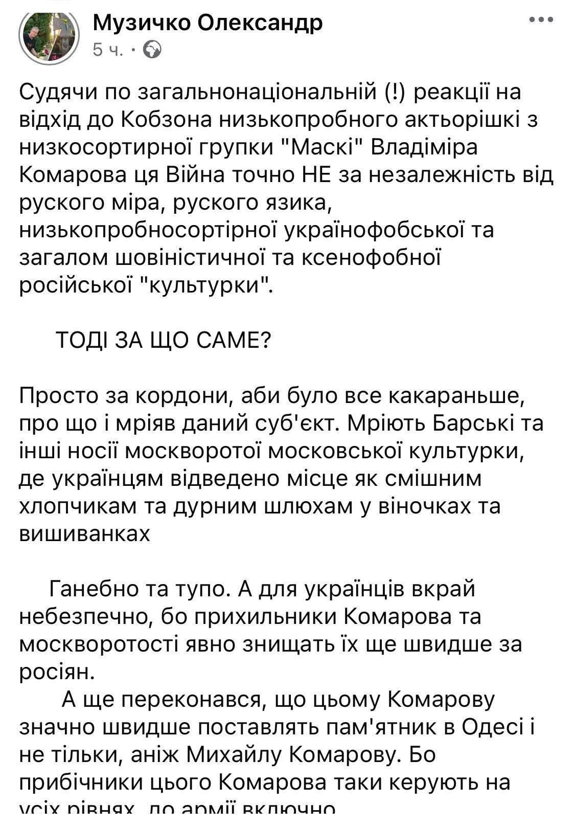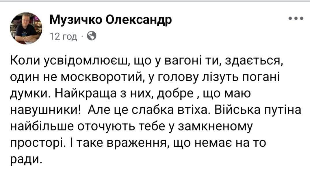 Він рвонувся геть. Навколо вже збиралася юрба військових у зеленому пікселі ММ-14, у мультикамі та навіть у синьому морському пікселі. Попереду йшов розхристаний, неголений солдат з цигаркою в зубах. «Нас розстріляли росіяни. А ти нас не поважаєш, бо ми не так розмовляли… Йди курсом, який відомий усім українцям», — сказав солдат і харкнув йому в обличчя.