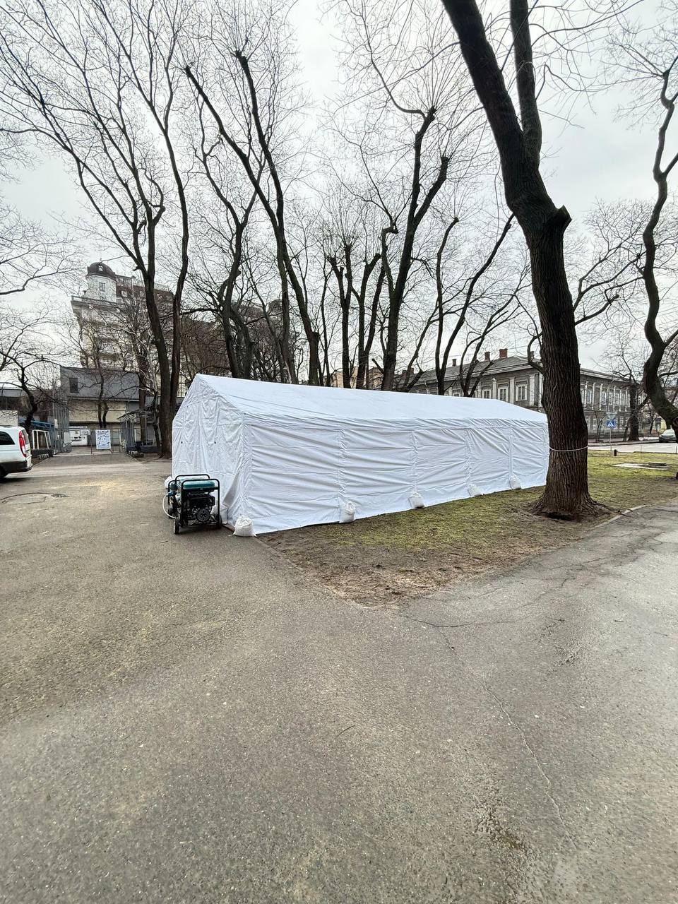 Поблизу будинків, де внаслідок ворожої атаки відсутнє електропостачання, встановлено намети для обігріву.