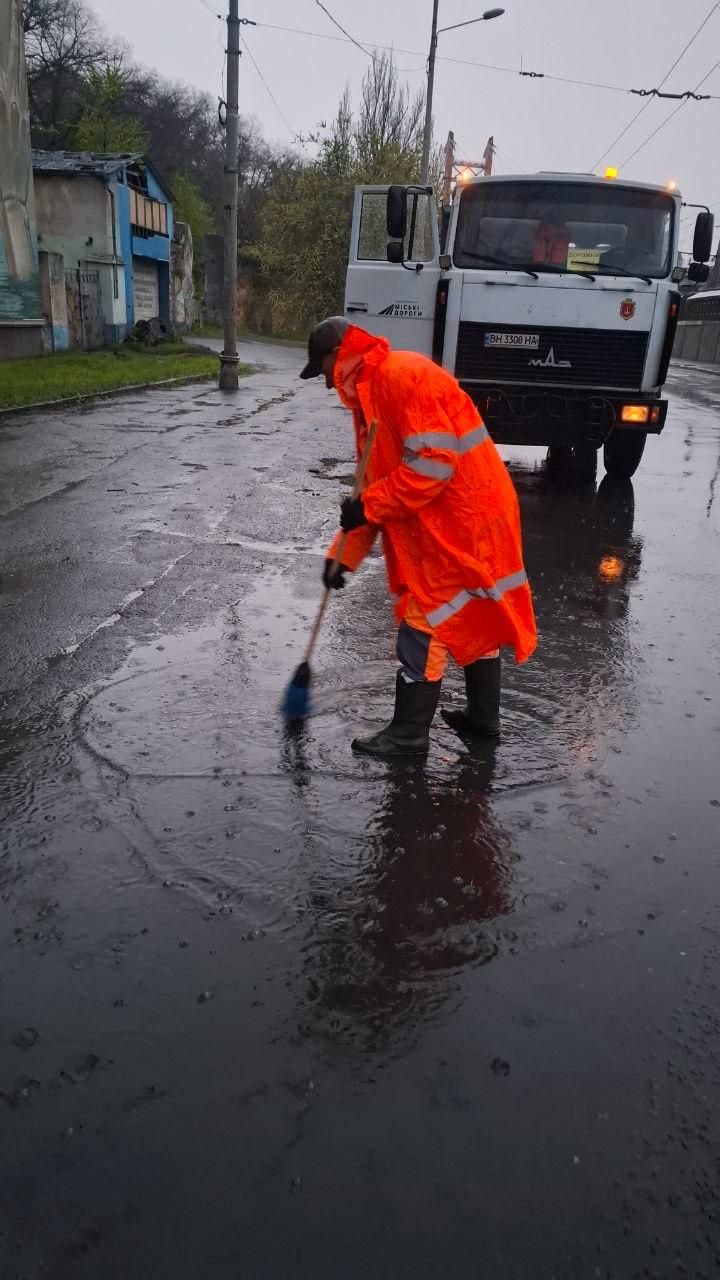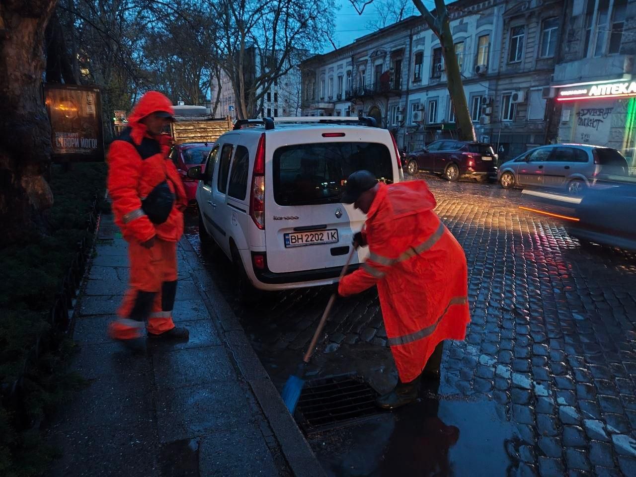 Через дощ і штормовий вітер в Одесі на вулицях працюють чергові та аварійні бригади комунальників, які розчищують зливову каналізацію. Оголошено штормове попередження.