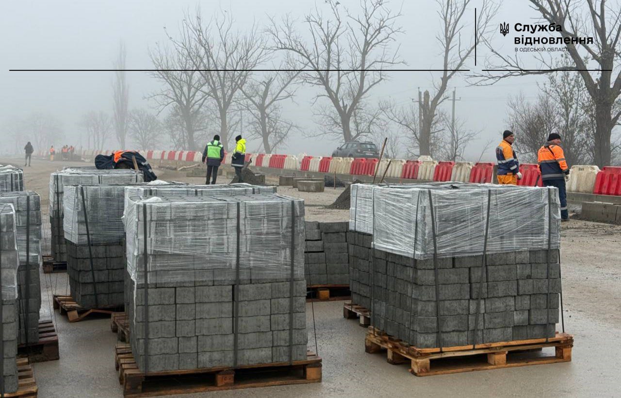 Зараз підрядники виконують монтаж каркасу будівель, влаштовують каналізаційну систему, покриття з плитки на самому майданчику та асфальтобетонні покриття на перехідно-швидкісних смугах руху.