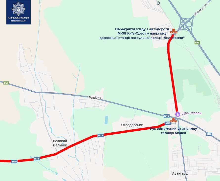 Внаслідок повністю закритого руху по автотрасі М-15 Одеса - Рені у селі Маяки через пошкодження від російського повітряного удару розташованого там об'єкту транспортної інфраструктури, патрульна поліція Одеської області обмежила рух і по іншим ділянками траси майже на всій її протяжності від Одеси до Ізмаїлу.