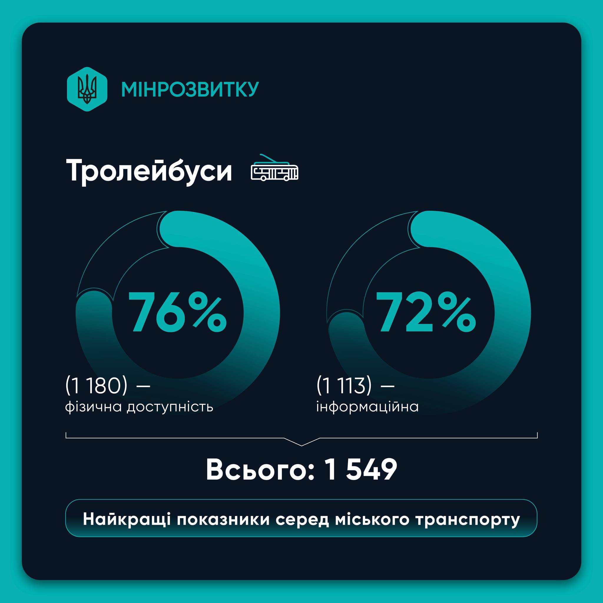 Найкраща ситуація з тролейбусами. Більшість мають низьку підлогу та системи інформування. Завдяки системному оновленню транспорту у Києві, Полтавській, Миколаївській, Львівській, Волинській та Івано-Франківській областях їх доступність майже 100%. Також більшість тролейбусів доступні для людей з інвалідністю в Одесі. Це - результат того, що починаючи з 2015 р. майже всі великі міста України оновили свої тролейбусні парки за рахунок європейського фінансування. При цьому деякі міста змогли повністю замінити старі тролейбуси новими. Окремо слід зазначити Київ, де при цьому загальна кількість тролейбусів за останні роки під час війни значно зменшилася через відсутність оновлення та виведення з роботи навіть відносно нових машин.