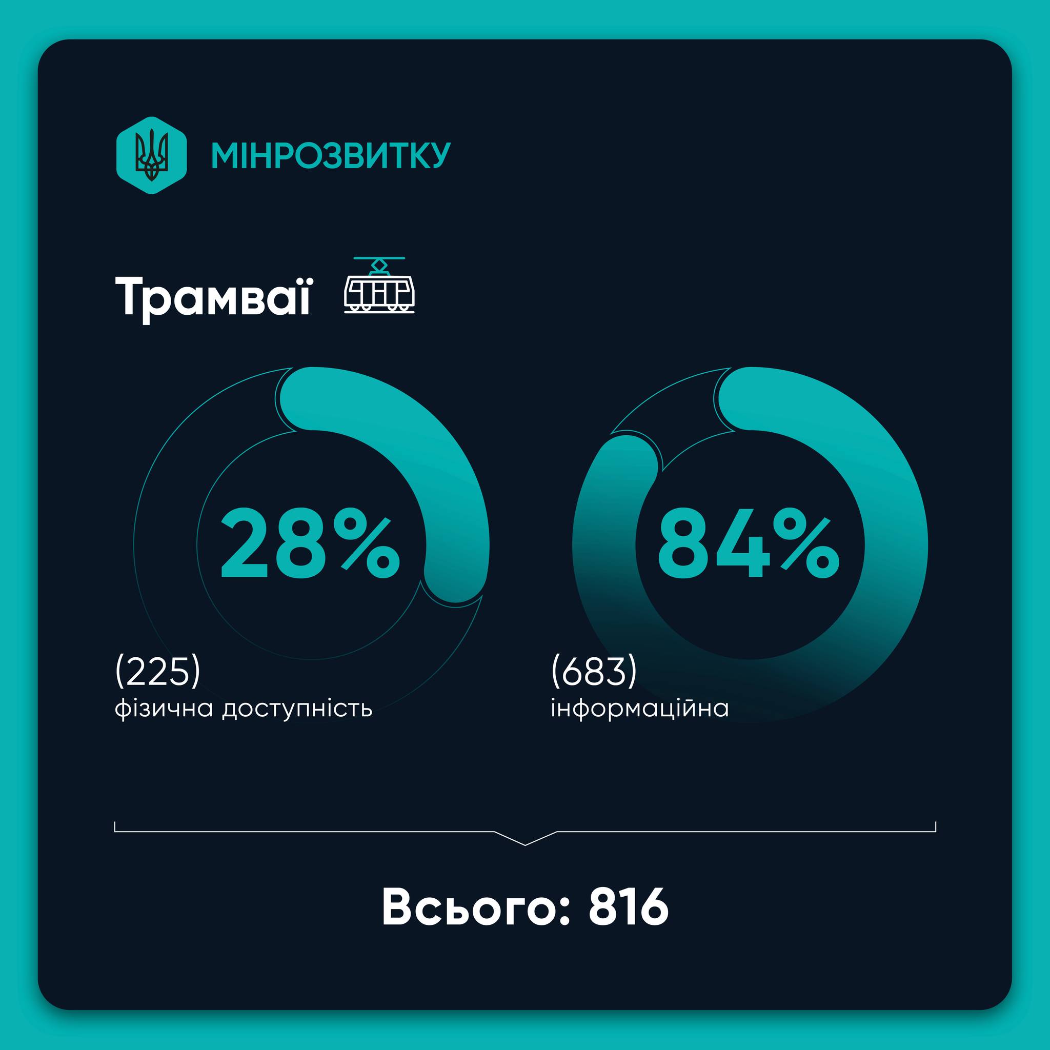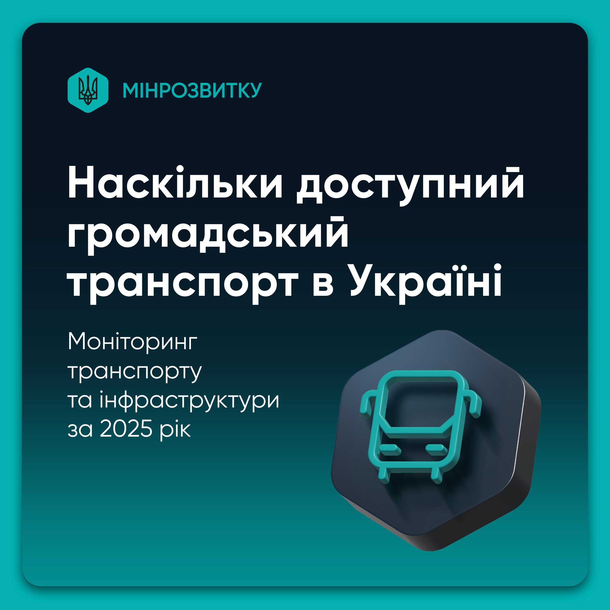 Мінрозвитку провело всеукраїнський моніторинг безбар’єрності в транспортній сфері. Обстеження відбулося у 23 областях і місті Києві та охопило всі види громадського транспорту і ключові об’єкти інфраструктури. Під час моніторингу оцінювали, чи може людина самостійно користуватися транспортом: зайти за допомогою пандусу, отримати текстове або звукове інформування, розміститися в салоні з кріслом колісним чи дитячою коляскою, безпечно пересуватися транспортом.