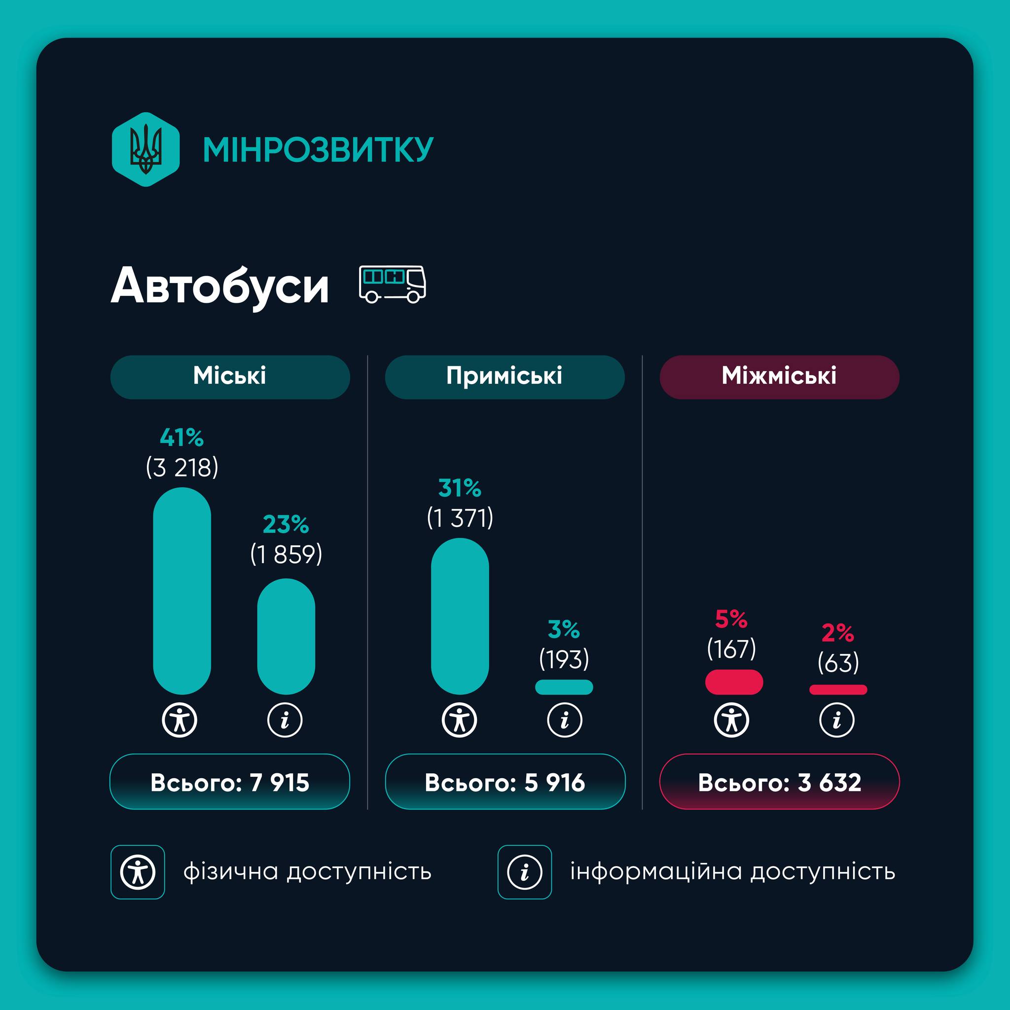 Міські автобуси поступово стають доступнішими, але на приміських і міжміських маршрутах ситуація одна з найскладніших, адже транспорту з пандусами та інформуванням там мало. Щодо міських автобусів - то ситуація покращується за рахунок закупівель перевізниками всіх форм власності вживаних низькопідлогових автобусів з Європи, також такі автобуси надходять до міст як гуманітарна допомога. А ось сегмент приміських автобусів "притягає" до себе, частіше за все, застарілі технічно і морально автобуси минулого покоління. Міжміські ж автобуси, з урахуванням специфіки їх роботи, - це окремий клас техніки, де доступність для людей з інвалідністю, особливо для пасажирів на з колясками чи на кріслах колісних, не враховується через необхідність розміщення великих багажних відсіків під підлогою.