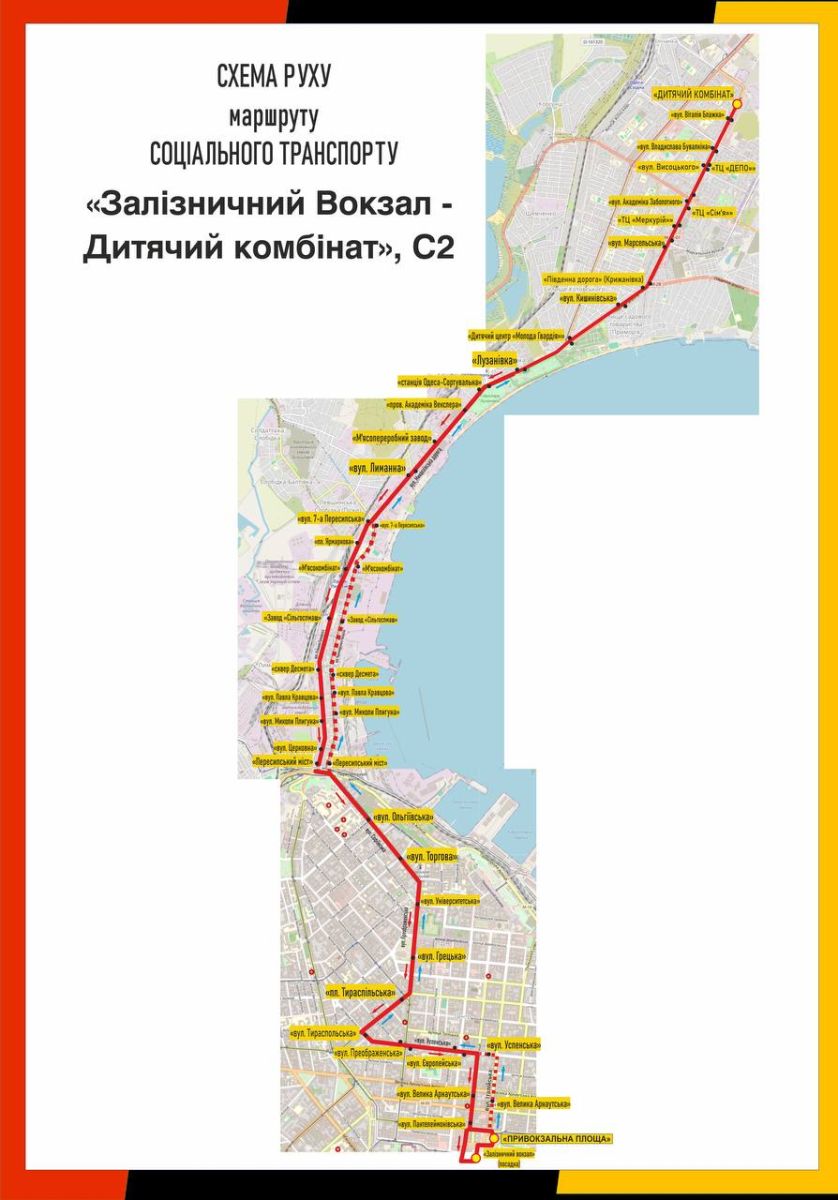 З 1 квітня 2026 року в Одесі, як повідомили у міськраді, запроваджується новий напрямок роботи соціального (безкоштовного) автобусного маршруту в тестовому режимі: С2, «Залізничний вокзал – Дитячий комбінат (вул. Семена Палія)».