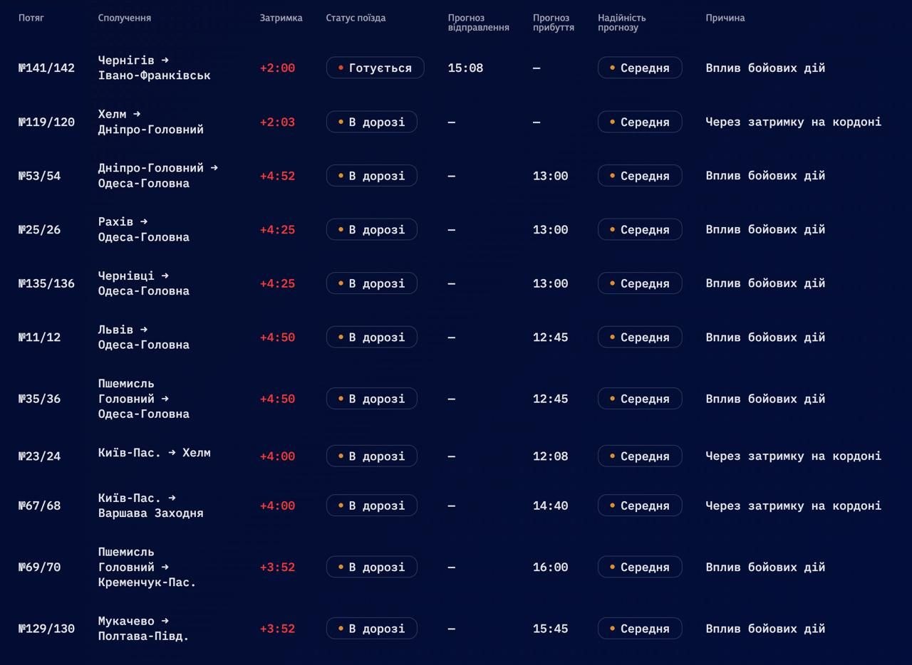 Зокрема, на час понад чотири години затримуються поїзди з Дніпра, Львова, Рахова, Пшемисля, Чернівців до Одеси. На понад дві години затримується поїзд з Ужгорода до Одеси.