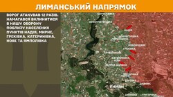 На Лиманському напрямку ворог атакував 12 разів. Намагався вклинитися в нашу оборону поблизу населених пунктів Надія, Мирне, Греківка, Катеринівка, Нове та Ямполівка.