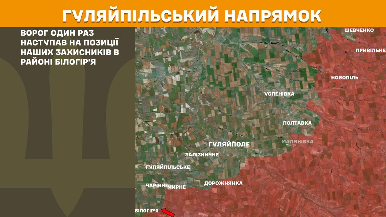 На Гуляйпільському напрямку ворог один раз наступав на позиції наших захисників в районі Білогір’я.