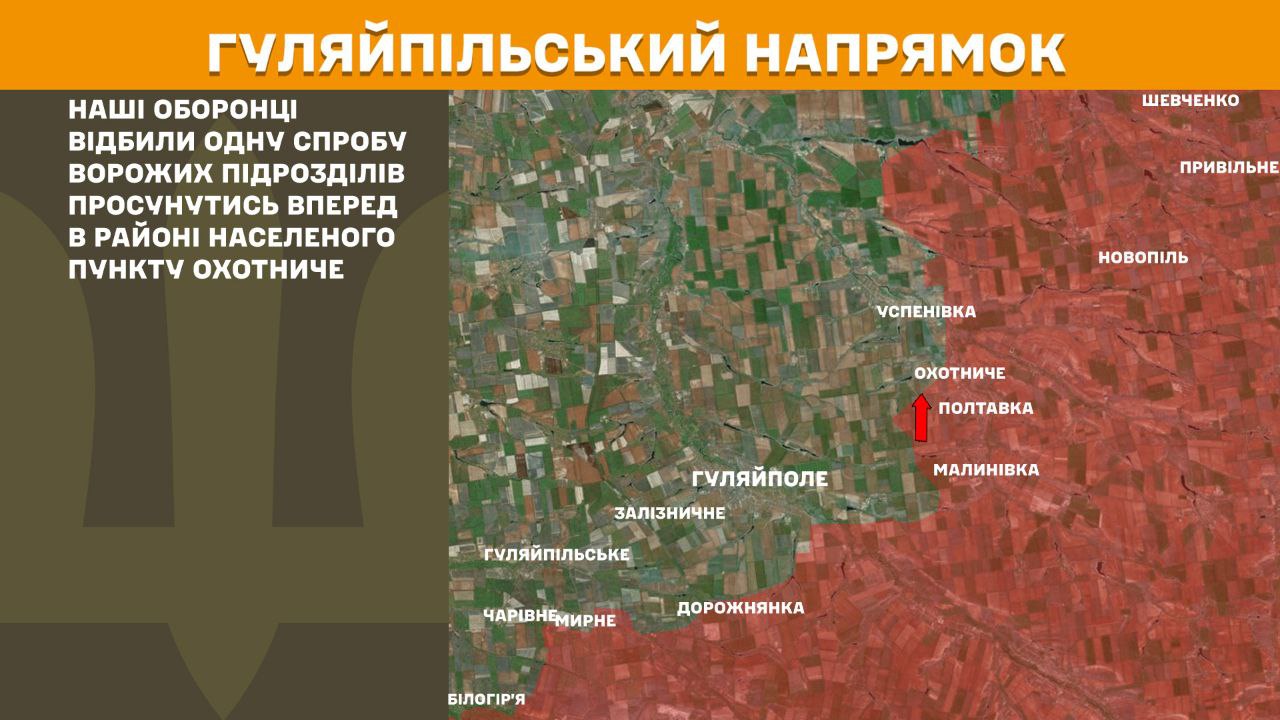 На Гуляйпільському напрямку наші оборонці відбили одну спробу ворожих підрозділів просунутись вперед в районі населеного пункту Охотниче.