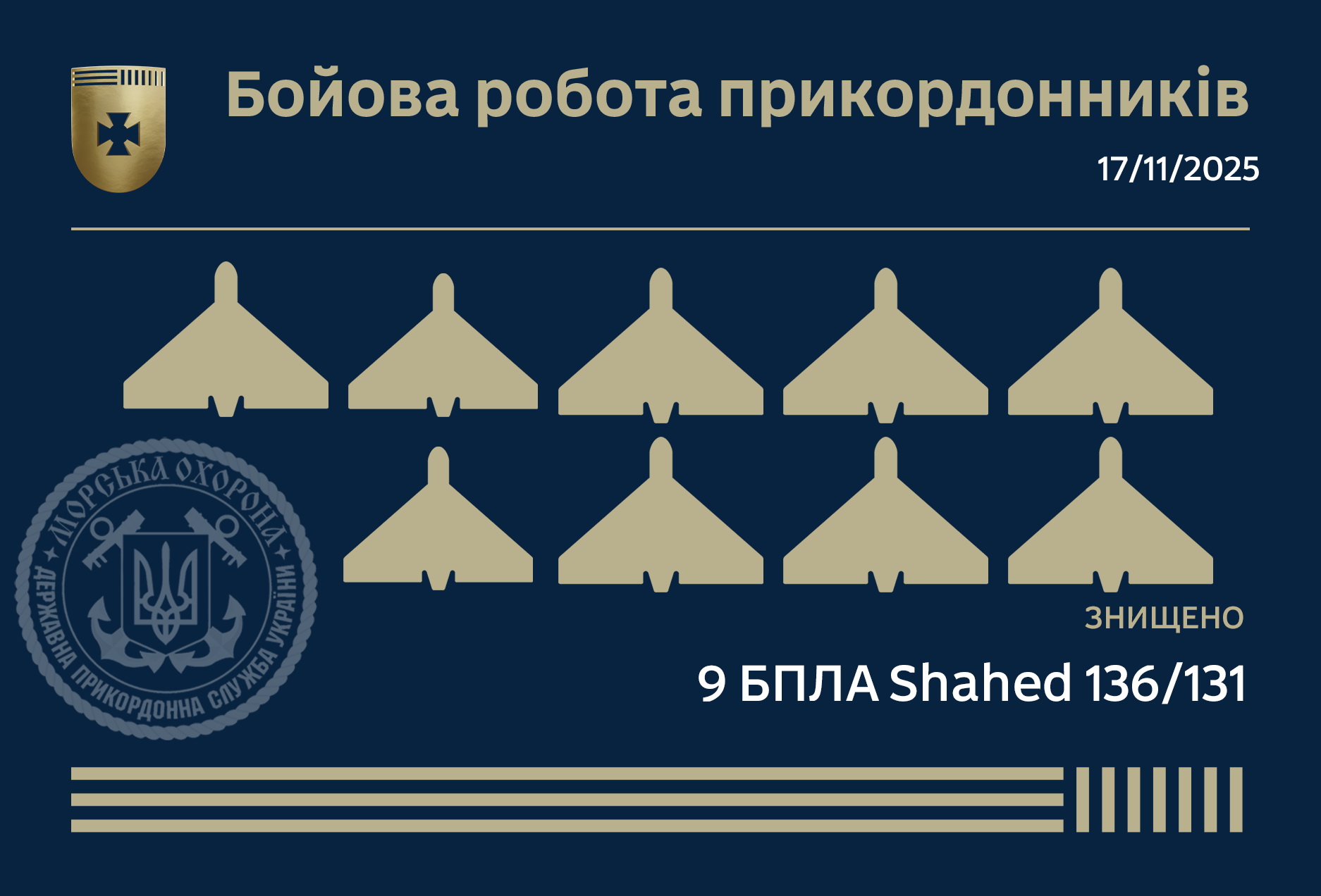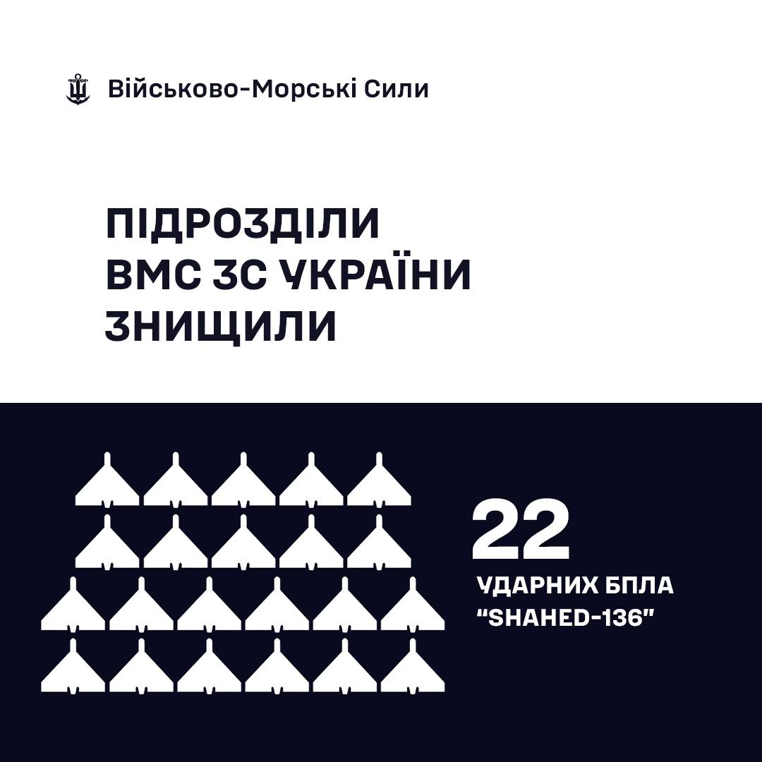 З цієї кількості 9 дронів при відбитті ударів по південним районам Одеської області знищили моряки-прикордонники Морської охорони ДПСУ, ще 22 ударні дрони на рахунку підрозділів ВМС України.