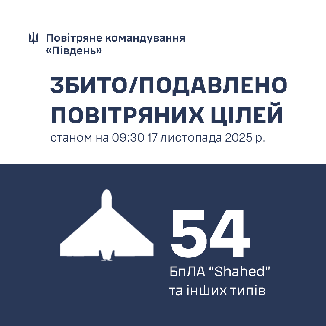 За інформацією Повітряного командування "Південь" станом на 9:30 17 листопада протиповітряною обороною півдня України збито/подавлено 54 ворожих БпЛА типу Shahed, "Гербера" та безпілотників інших типів, з яких 52 - у Одеській області.