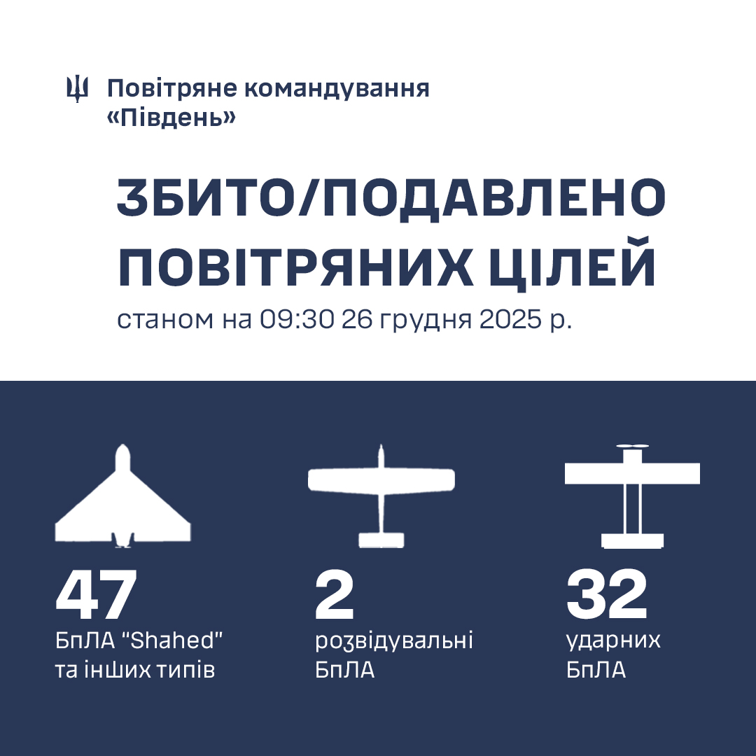 Повітряне командування "Південь" інформує, що станом на 9:30 26 грудня 2025 року протиповітряною обороною півдня України у Одеській області збито/подавлено 47 ворожих БпЛА типу Shahed, Гербера і дронів інших типів.