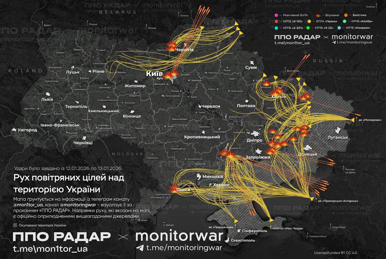 У ніч на 13 січня (з 18:00 12 січня) противник атакував 18-ма балістичними Іскандер-М/зенітними керованими ракетами С-300 із Курської, Брянської, Воронезької обл. - рф, ТОТ Криму, 7-ма ракетами Іскандер-К із Курської та Бєлгородської обл. – рф, а також 293 ударними БпЛА типу Shahed, Гербера і безпілотниками інших типів із напрямків: Курськ, Орел, Шаталово, Міллерово, Приморсько-Ахтарськ – рф., Кача – ТОТ АР Криму, близько 200 із них – "шахеди".