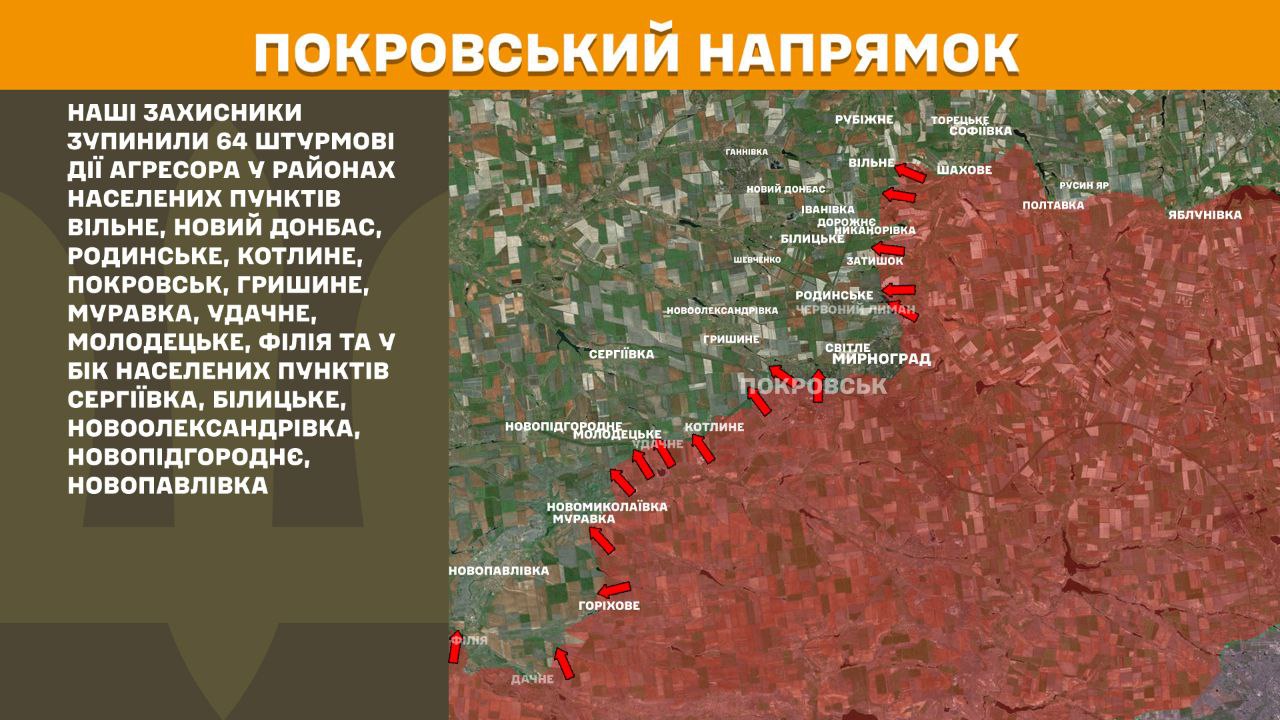 На Покровському напрямку наші захисники зупинили 64 штурмові дії агресора у районах населених пунктів Вільне, Новий Донбас, Родинське, Котлине, Покровськ, Гришине, Муравка, Удачне, Молодецьке, Філія та у бік населених пунктів Сергіївка, Білицьке, Новоолександрівка, Новопідгороднє, Новопавлівка.