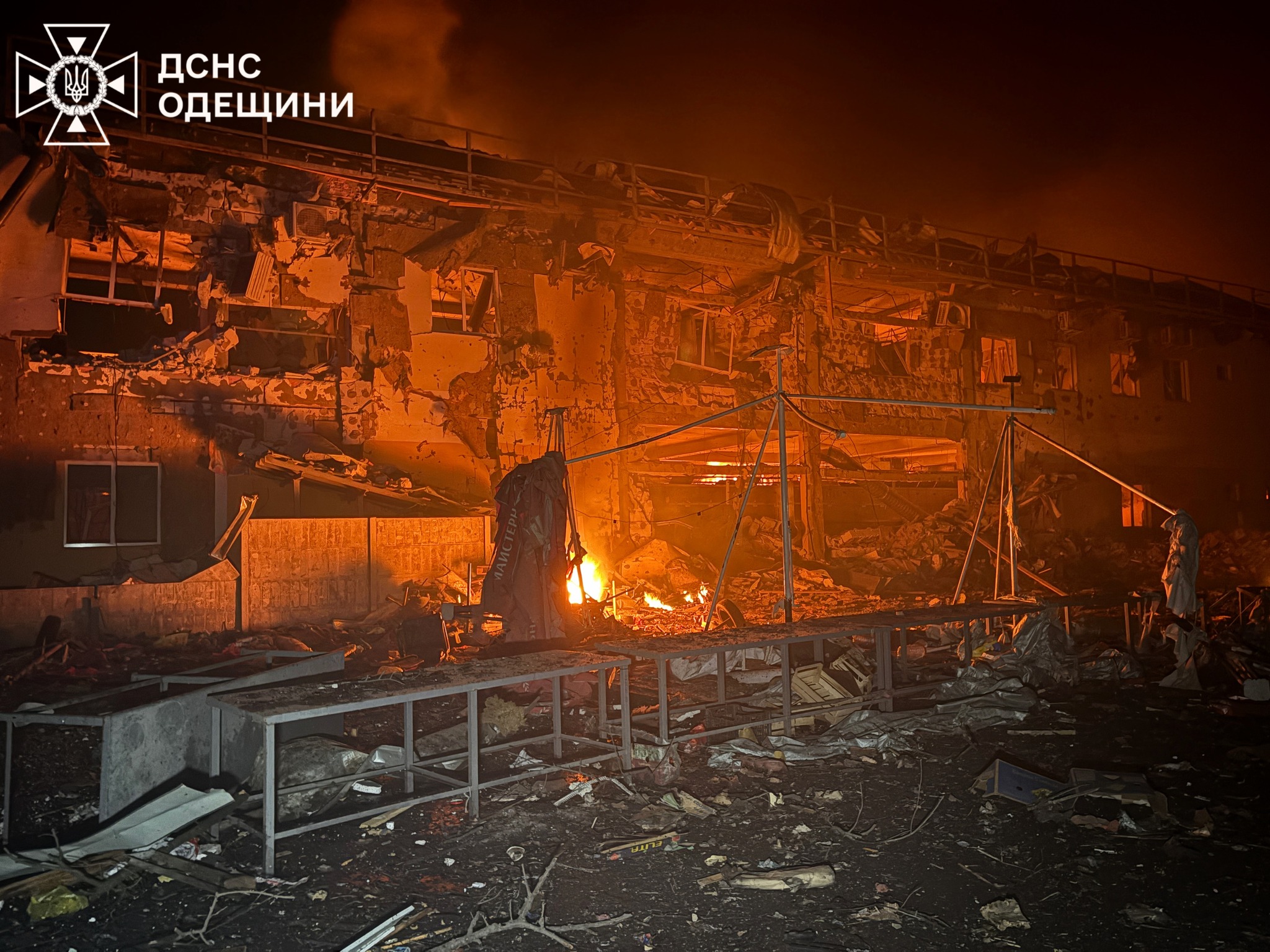 Суттєвих пошкоджень зазнала торговельна інфраструктура: вогнем охопило павільйони на одному з ринків міста та пошкоджено будівлю супермаркету.