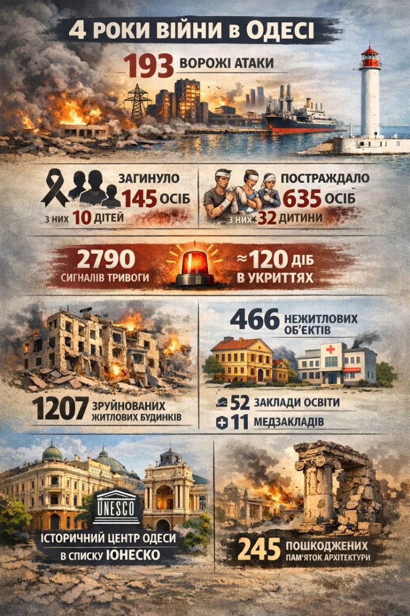 Внаслідок російських обстрілів в Одесі загинуло 145 цивільних людей, серед них 10 дітей. Постраждало 635 осіб, з них 32 дитини.