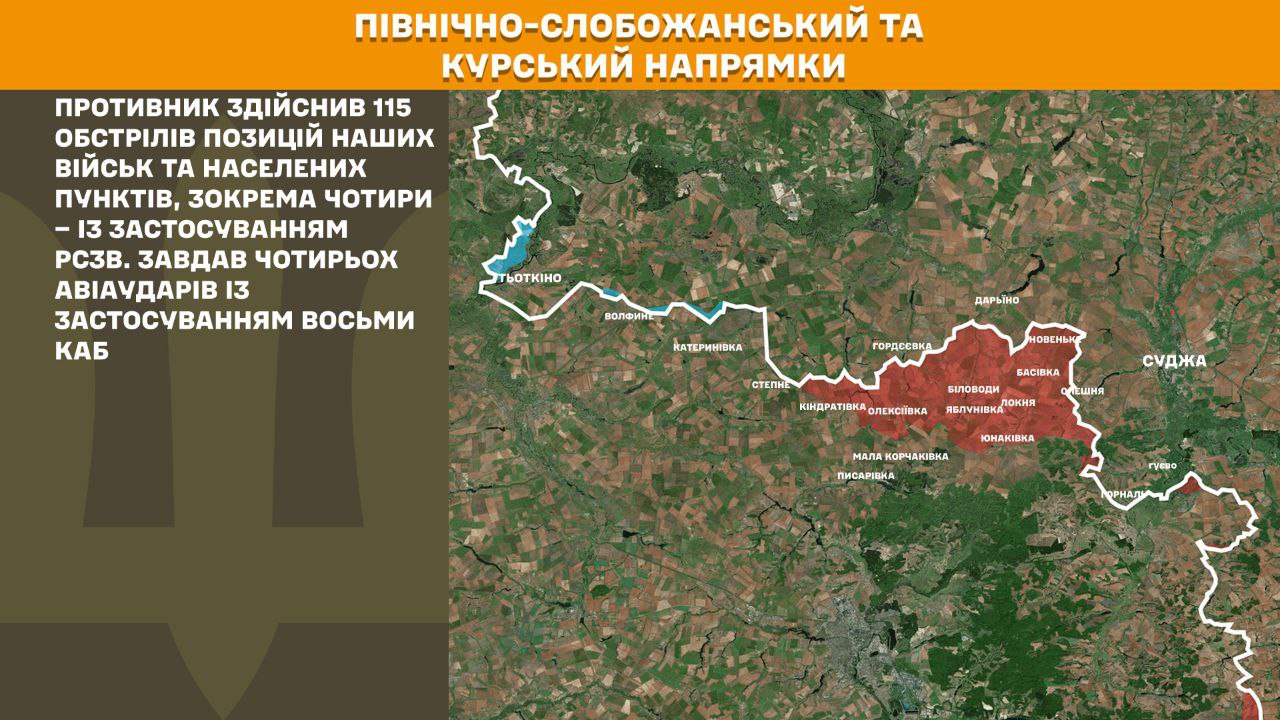 На Північно–Слобожанському і Курському напрямках минулої доби противник здійснив 115 обстрілів позицій наших військ та населених пунктів, зокрема чотири – із застосуванням РСЗВ. Завдав чотирьох авіаударів із застосуванням восьми КАБ.