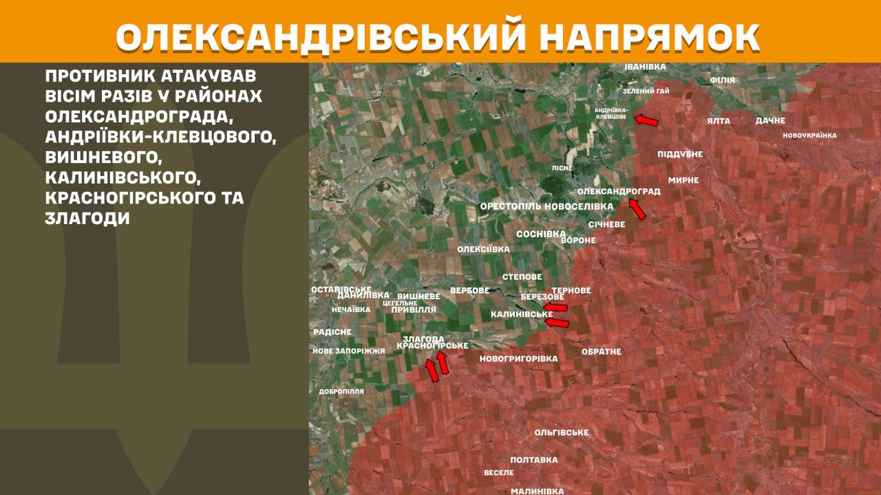 На Олександрівському напрямку противник атакував вісім разів у районах Олександрограда, Андріївки-Клевцового, Вишневого, Калинівського, Красногірського та Злагоди.