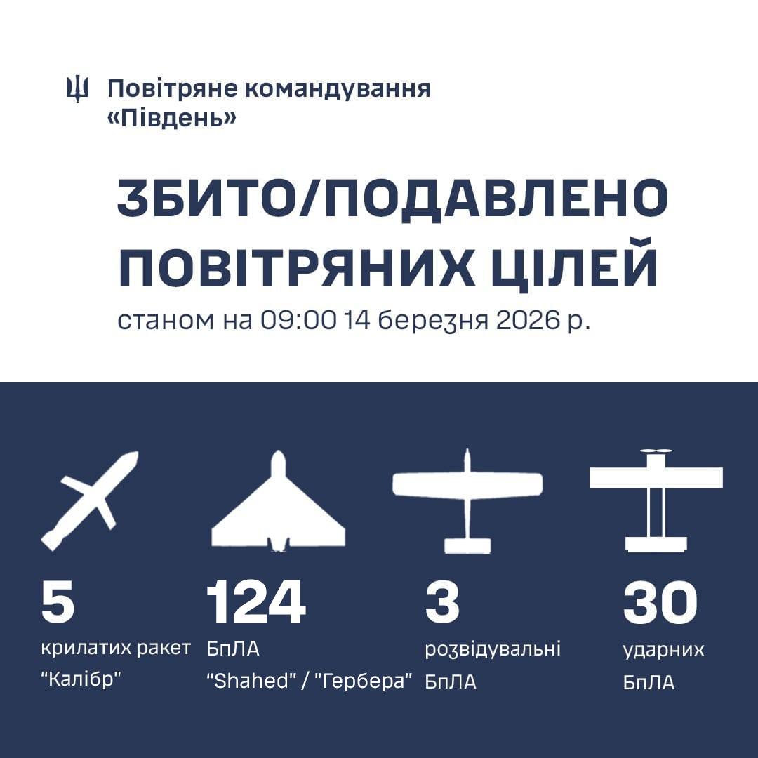 Станом на 9:00 14 березня протиповітряною обороною півдня України збито/подавлено 5 крилатих ракет «Калібр», 124 БпЛА типу Shahed, Гербера, 30 ударних та три розвідувальні дрони, інформує Повітряне командування "Південь".