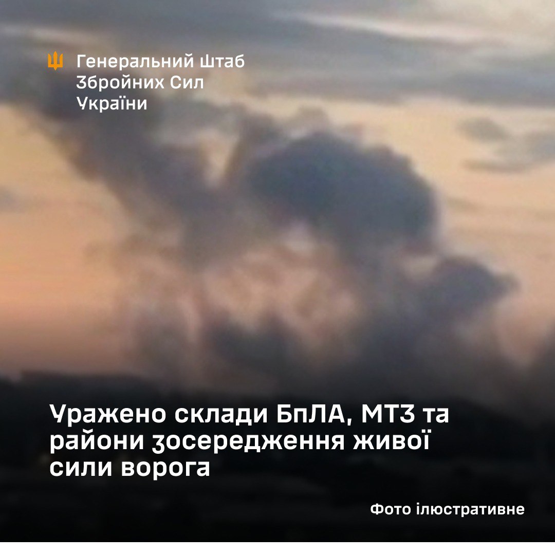 Зафіксовано ураження складу матеріально-технічного забезпечення поблизу н.п. Осіпенко (ТОТ Запорізької обл.), а також складу зберігання БпЛА у районі Приморська (ТОТ Запорізької обл.).