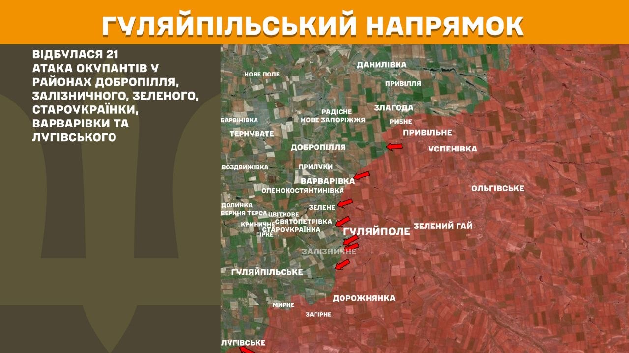 На Гуляйпільському напрямку відбулася 21 атака окупантів у районах Добропілля, Залізничного, Зеленого, Староукраїнки, Варварівки та Лугівського.