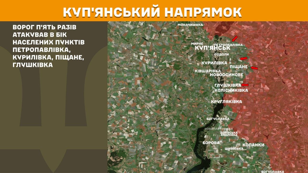 На Куп’янському напрямку ворог п’ять разів атакував в бік населених пунктів Петропавлівка, Курилівка, Піщане, Глушківка.