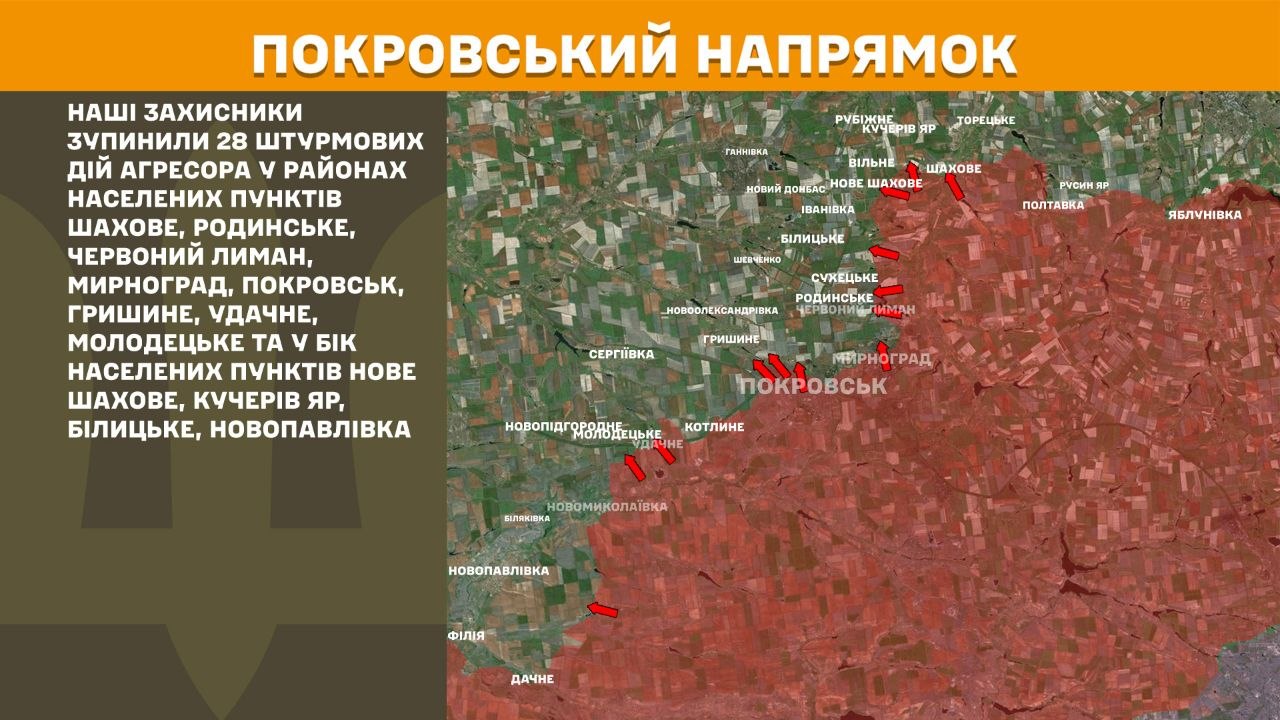 На Покровському напрямку наші захисники зупинили 28 штурмових дій агресора у районах населених пунктів Шахове, Родинське, Червоний Лиман, Мирноград, Покровськ, Гришине, Удачне, Молодецьке та у бік населених пунктів Нове Шахове, Кучерів Яр, Білицьке, Новопавлівка.