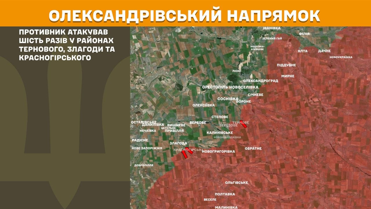 На Олександрівському напрямку противник атакував шість разів у районах Тернового, Злагоди та Красногірського.