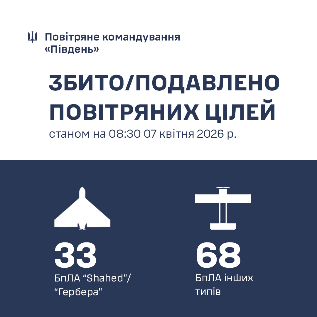 Повітряне командування "Південь" інформує, що станом на 8:30 7 протиповітряною обороною півдня України збито/подавлено 33 БпЛА типу Shahed, Гербера та 68 дрони інших типів.