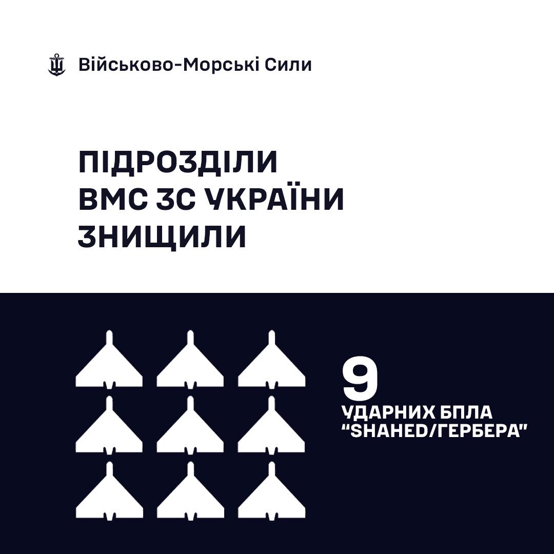 Із цієї кількості 9 "шахедів" збито ВМС України, ще три - на рахунку Морської охорони ДПСУ.