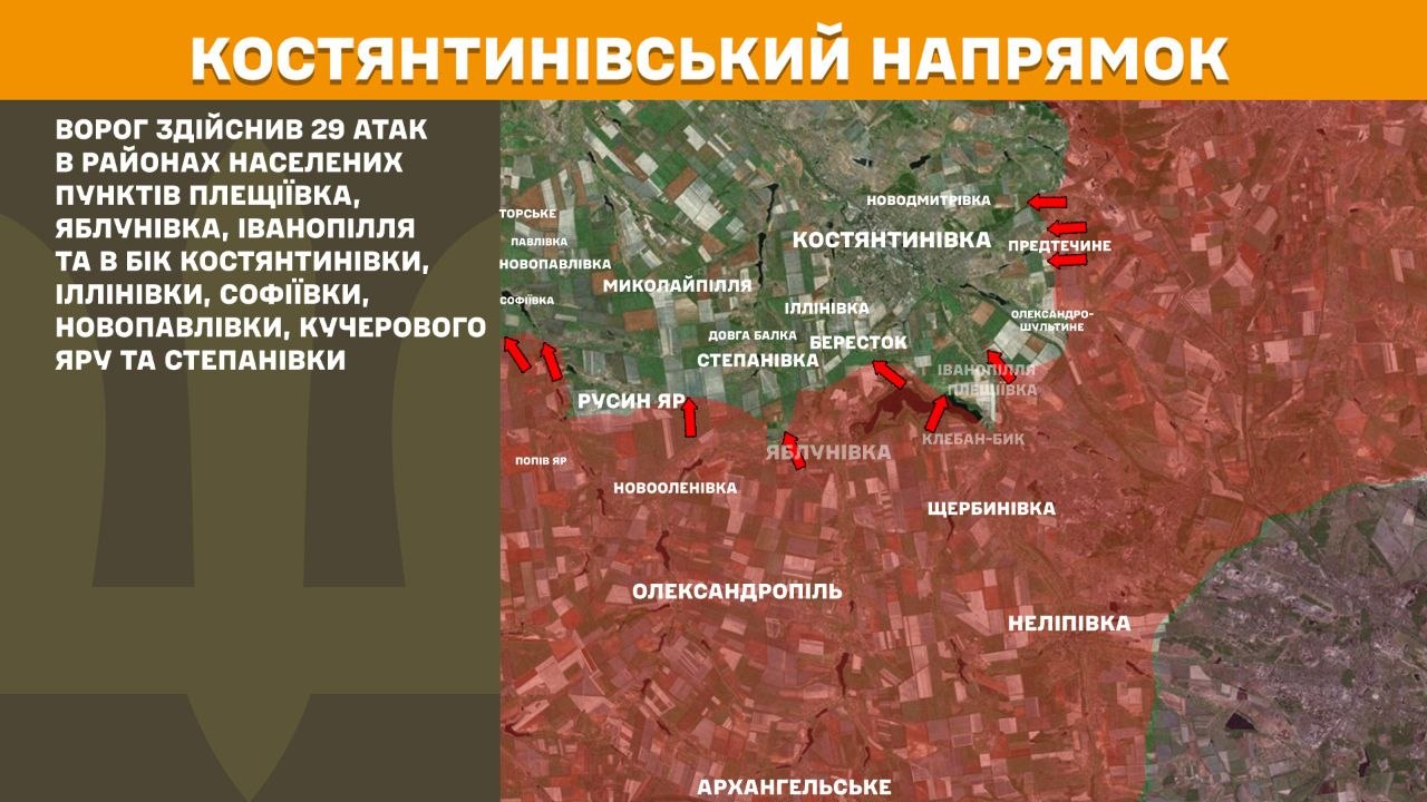 На Костянтинівському напрямку, за уточненою інформацією, ворог здійснив 29 атак в районах населених пунктів Плещіївка, Яблунівка, Іванопілля та в бік Костянтинівки, Іллінівки, Софіївки, Новопавлівки, Кучерового Яру та Степанівки.