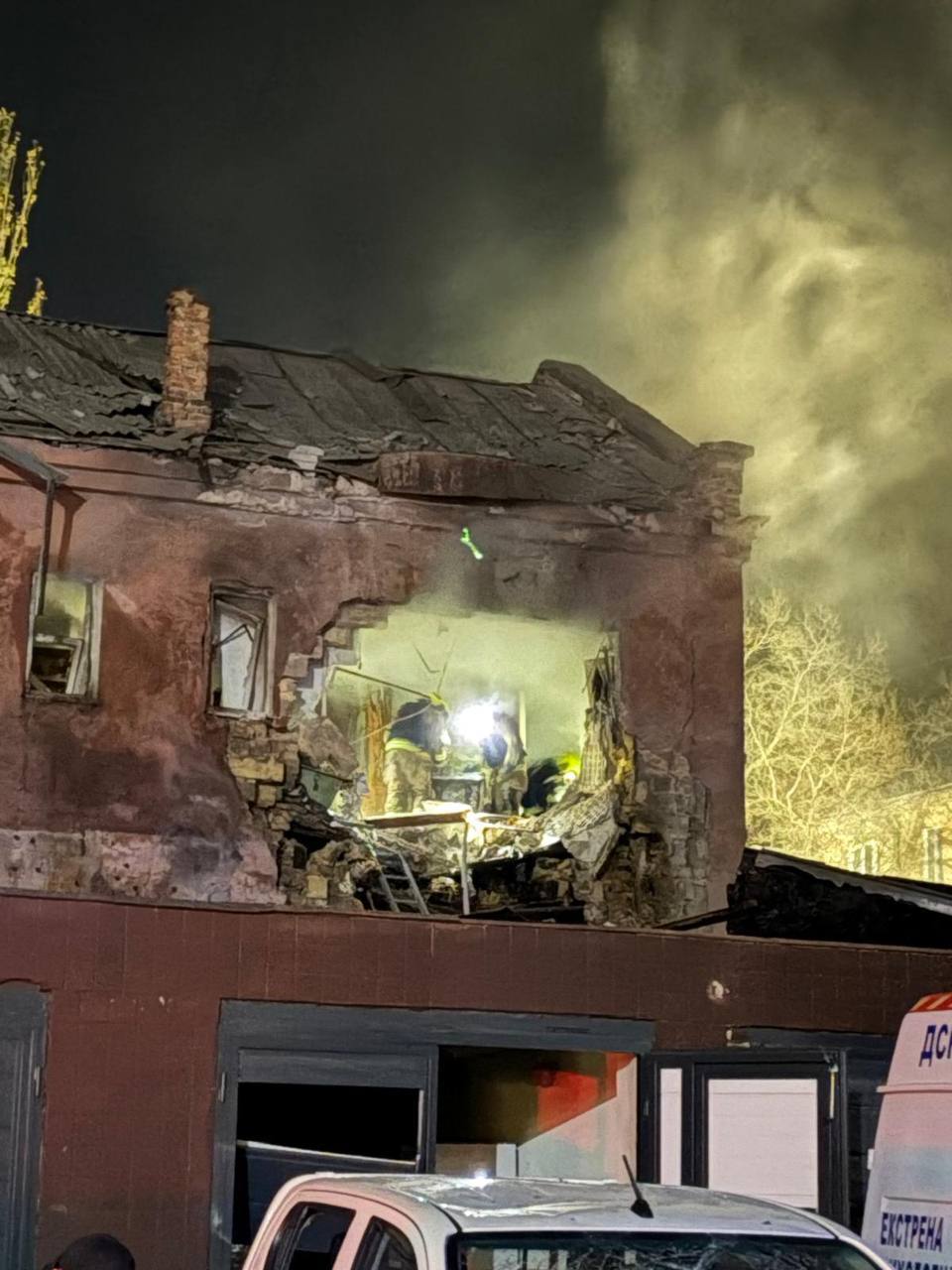 Зруйновано два 2-поверхові житлові будинки, де пожежники врятували одну людину та евакуювали ще 20 осіб (серед них 2 дітей). Постраждали 7 людей.