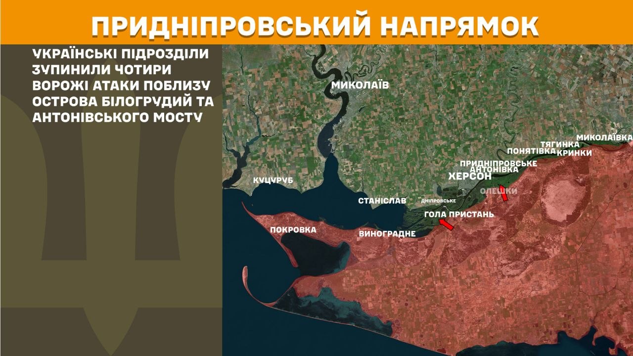 На Придніпровському напрямку українські підрозділи зупинили чотири ворожі атаки поблизу острова Білогрудий та Антонівського мосту.