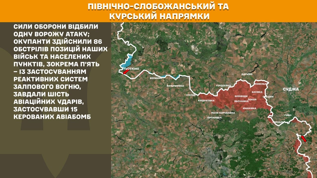 На Північно-Слобожанському і Курському напрямках минулої доби Сили оборони відбили одну ворожу атаку; окупанти здійснили 86 обстрілів позицій наших військ та населених пунктів, зокрема п’ять – із застосуванням реактивних систем залпового вогню, завдали шість авіаційних ударів, застосувавши 15 керованих авіабомб.