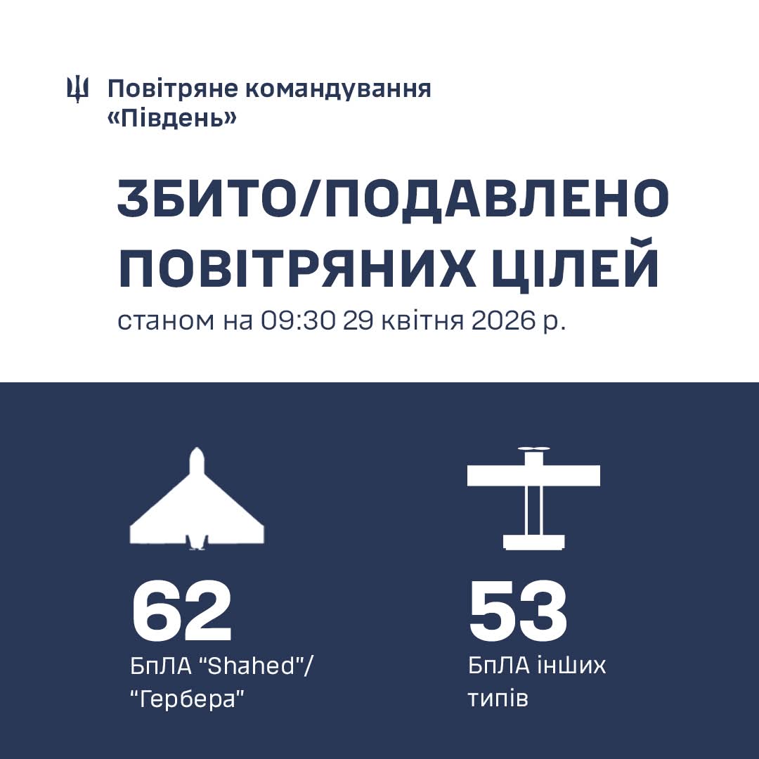 За даними повітряного командування "Південь", станом на 9:30 29 квітня протиповітряною обороною півдня України збито/подавлено 62 БпЛА типу Shahed, Гербера та 53 дрони інших типів.